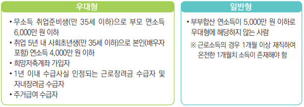부부합산 연소득이 5,000만 원(신혼부부, 2자녀 이상 가구, 혁신도시 이전 공공기관, 재개발구역 이주자는 6,000만 원) 이하, 순자산가액 3억 6,100만 원 이하인 만 19세 이상 무주택세대주