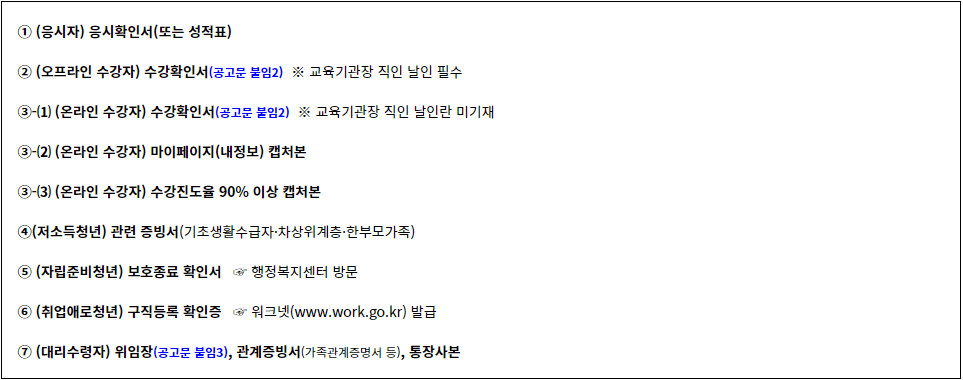 - (선정기준) 연령, 주소, 미취업 여부, 지원분야, 응시일(수강일) 등 지원 요건 모두 충족