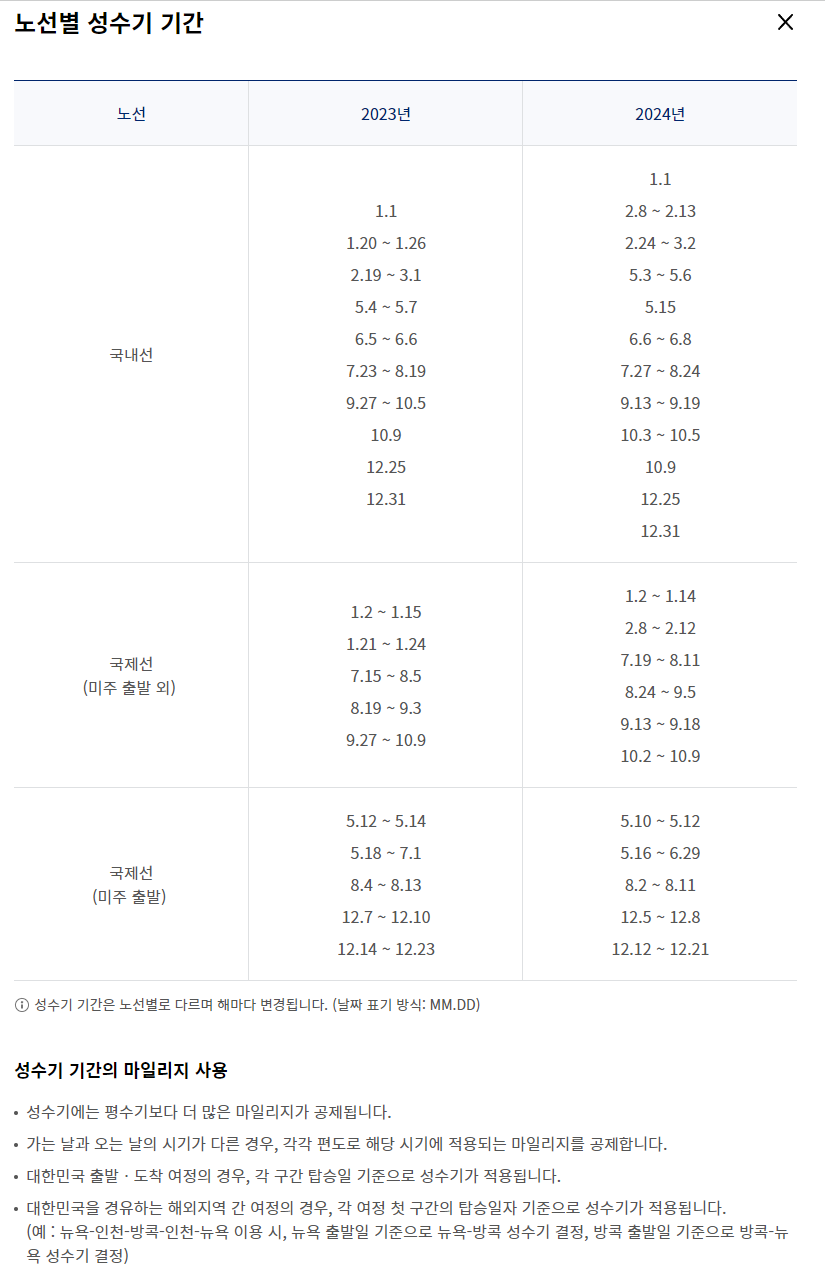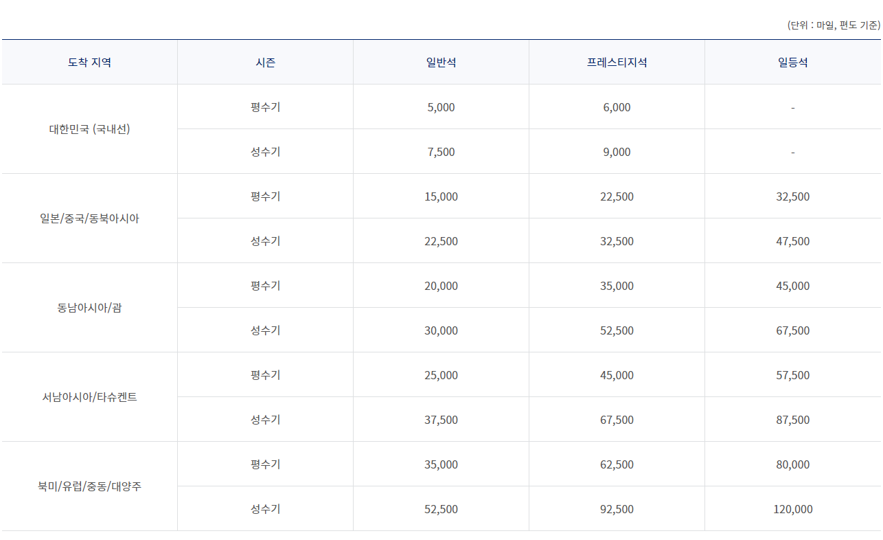 마일리지로 여행하시려는 분들은 한국 성수기뿐만 아니라, 나라별 성수기도 체크하셔서 예약하세요!!!