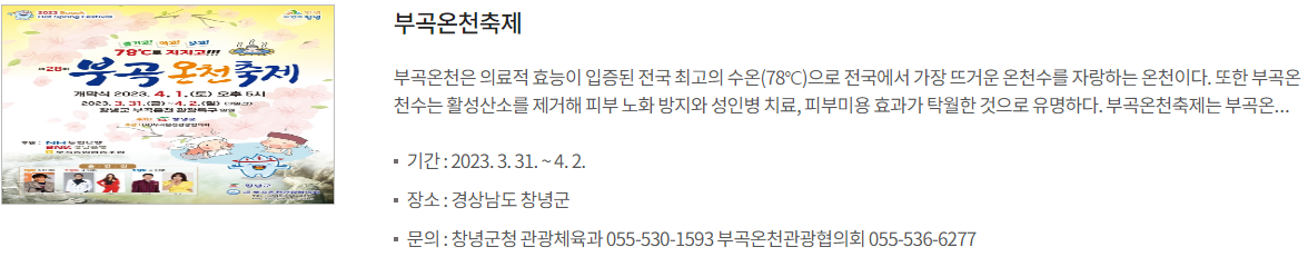 하단의 축제정보는 한국관광공사가 운영하는 대한민국 구석구석 누리집 정보가 연동되어 게시된 것으로,