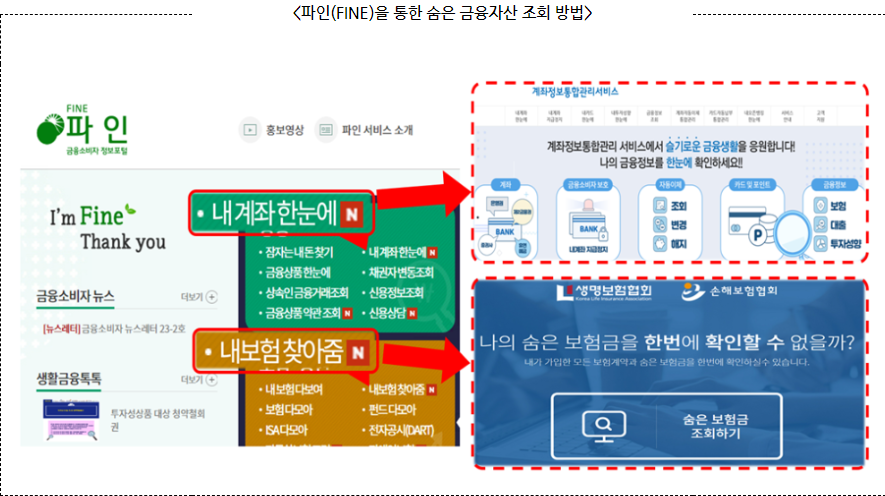 * 금감원 금융소비자 정보포털 파인(fine.fss.or.kr)의 ‘내계좌 한눈에’, ‘내보험 찾아줌’ 등